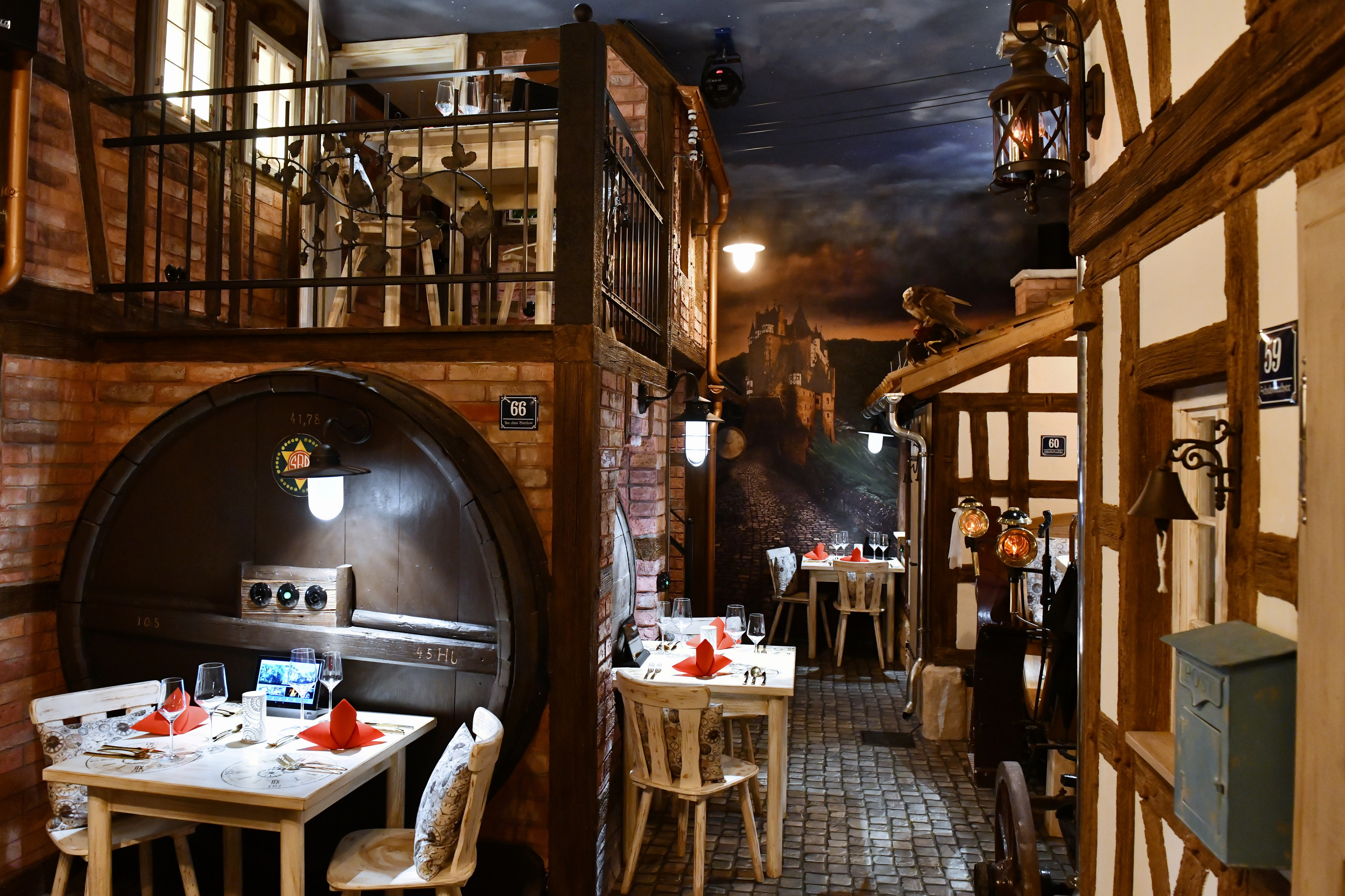 Ein Blick in das Erlebnisrestaurant „Zeitsprung“, das die Gäste in eine vergangene Zeit entführt. Zu sehen ist das verträumte Ensemble aus Hufschmiede, Apotheke, Kornmühle und Schuhmacherhaus – eine täuschend echte Kulisse, die wie aus einer mittelalterlichen Stadt entsprungen scheint. Ein faszinierendes Ambiente, das Geschichte lebendig werden lässt. | ||